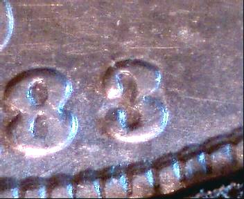 This variety has the underlying 2 approximately centered between the second 8 and the 3. In this photo, you can see the curved baseline of the 2, and a little bit of the downward stroke of the 2 between the arms of the 3. Also visible is the chip of the base of an underlying 8 to the left of the second 8, approximately halfway between the two eights and in line with the baseline of the eights.
