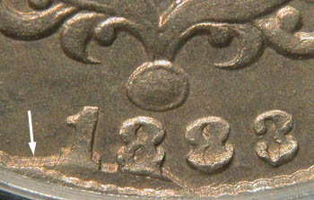 This variety is the least dramatic of the three traditionally recognized 1883/2 varieties (FS5c-013, FS5c-013.1, and FS5c-013.2). Most of the time, only the remnants of the base of the 2 are visible. According to Walter Breen's Complete Encyclopedia of U.S. and Colonial Coins, specimens of this variety do exist that show most of the 2. They are extremely rare. I have never seen a specimen with a complete underlying 2, but the first picture below comes close. Because this variety is not dramatic it can occasionally be cherrypicked.
